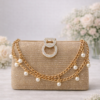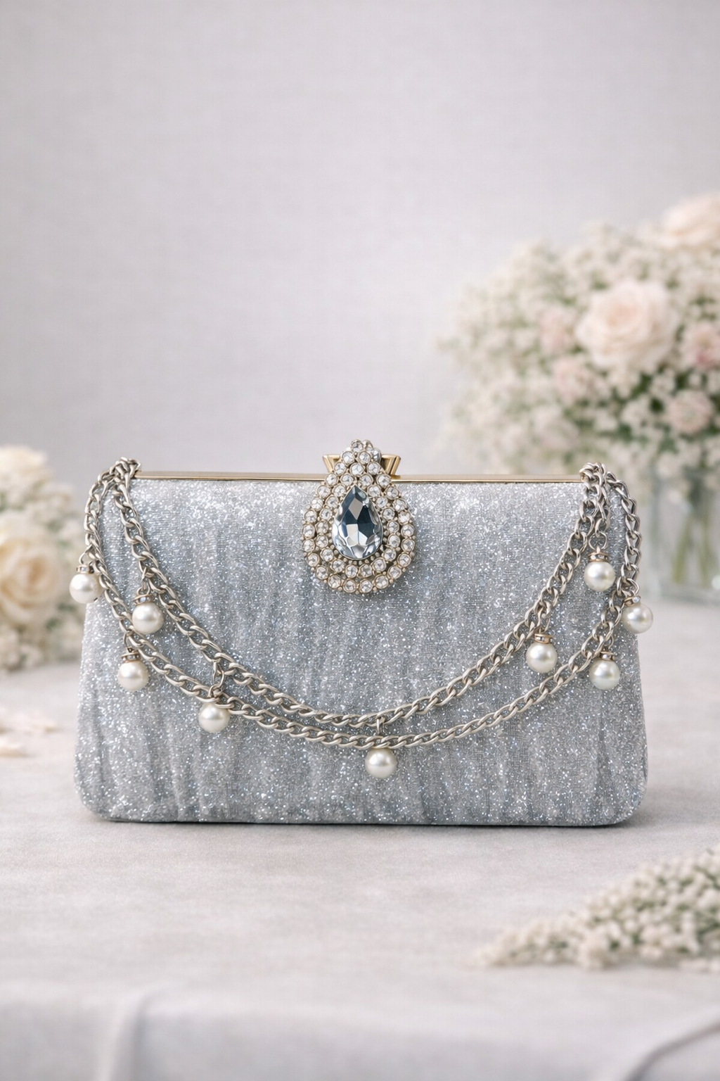 Complete your party look with this luxurious silver shimmer clutch, featuring a dazzling crystal stone clasp, soft ruched glitter texture, and an elegant pearl-detailed chain. Designed to add graceful sparkle, this clutch is perfect for weddings, formal events, and festive nights.