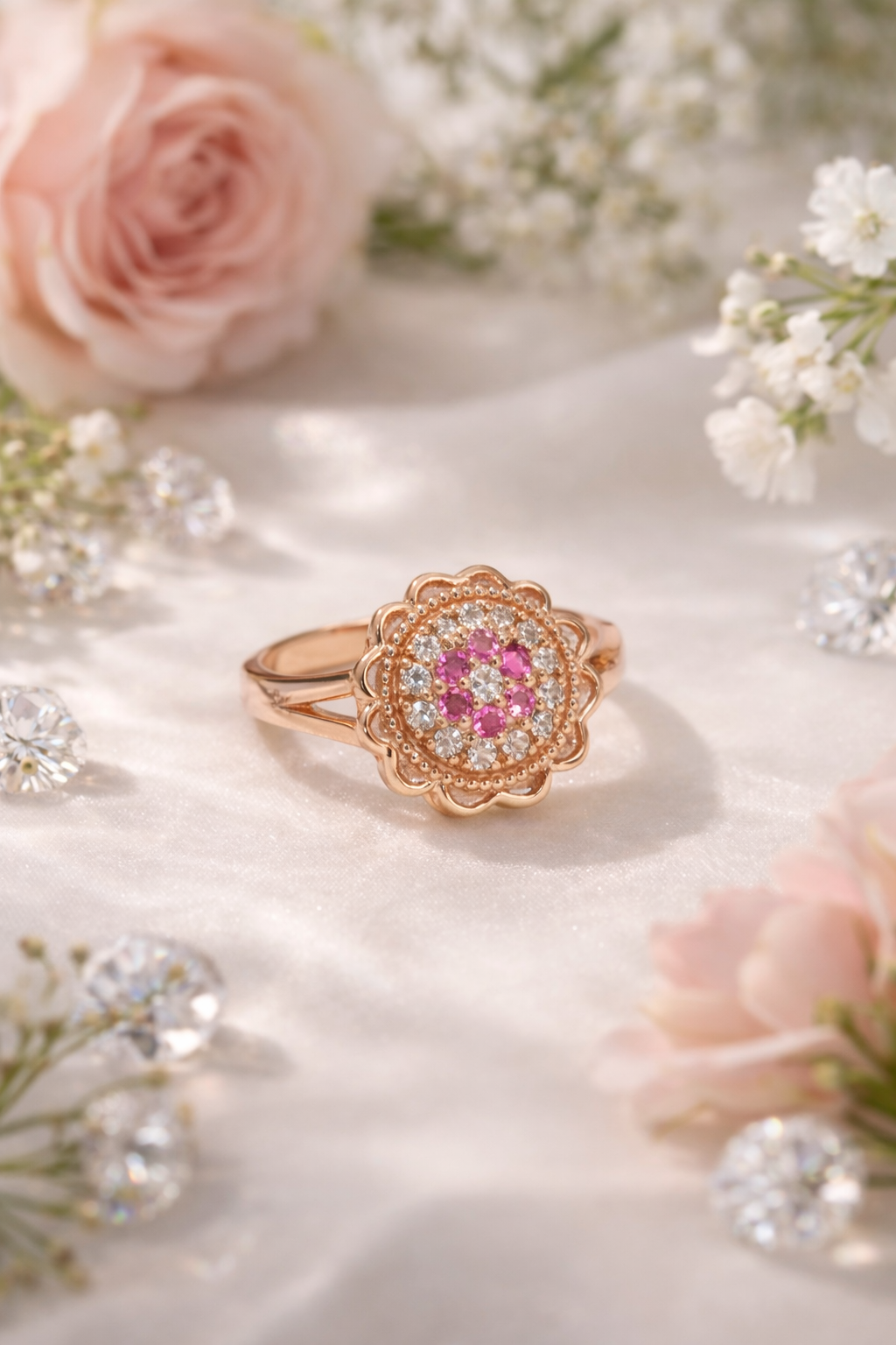 Discover the beauty of delicate craftsmanship with this stunning floral-inspired rose gold ring. Designed with sparkling white stones surrounding vibrant pink gems, this piece radiates grace, romance, and sophistication.